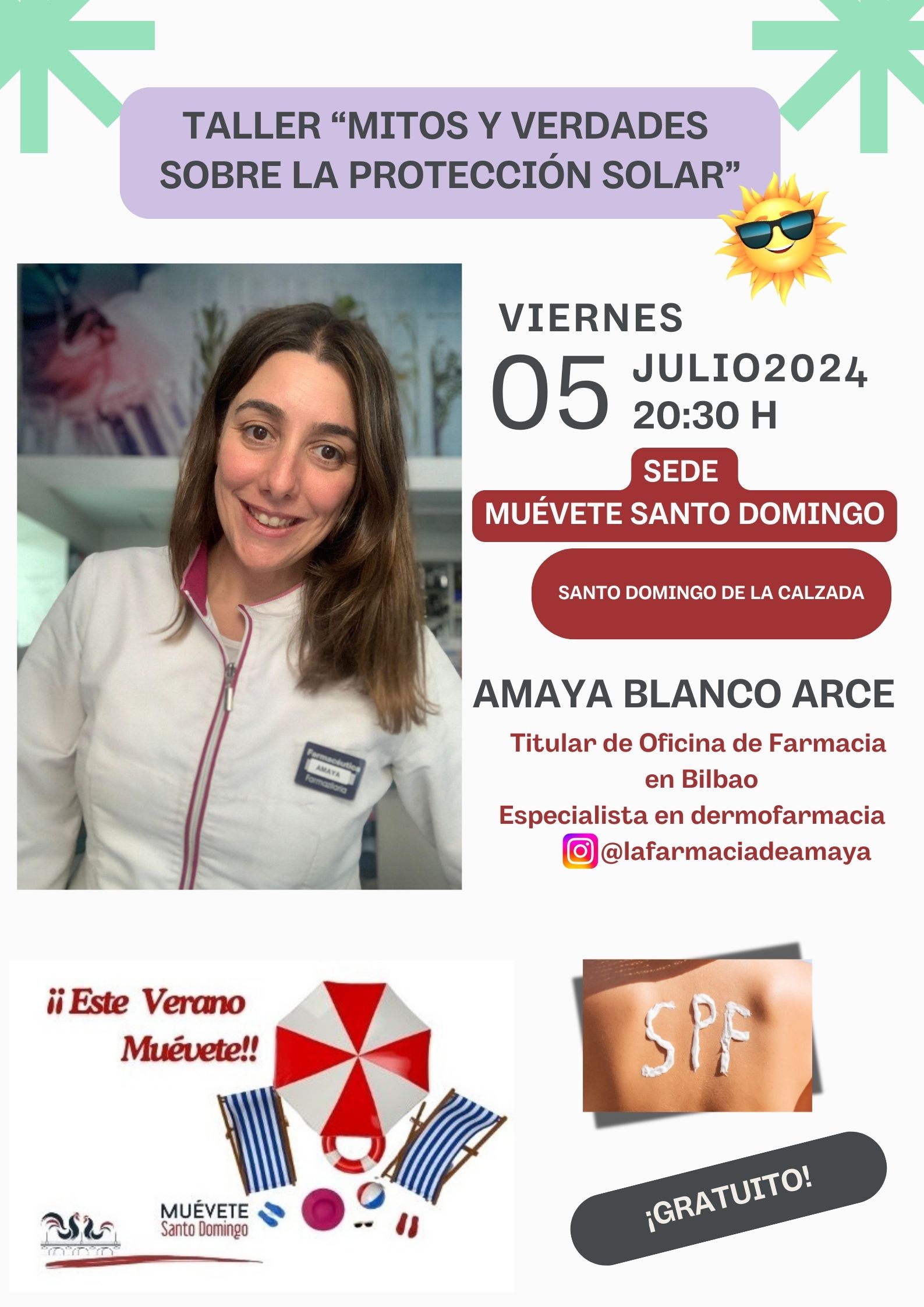 Muévete Santo Domingo organizará el próximo viernes 05 de julio a las 20:30 horas en la Sede de Muévete Santo Domingo en la Calle Rodolfo Varona, un taller sobre “Mitos y verdades sobre la protección solar”, que será impartido por la Titular de Oficina de Farmacia en Bilbao y especialista en dermofarmacia, Amaya Blanco.